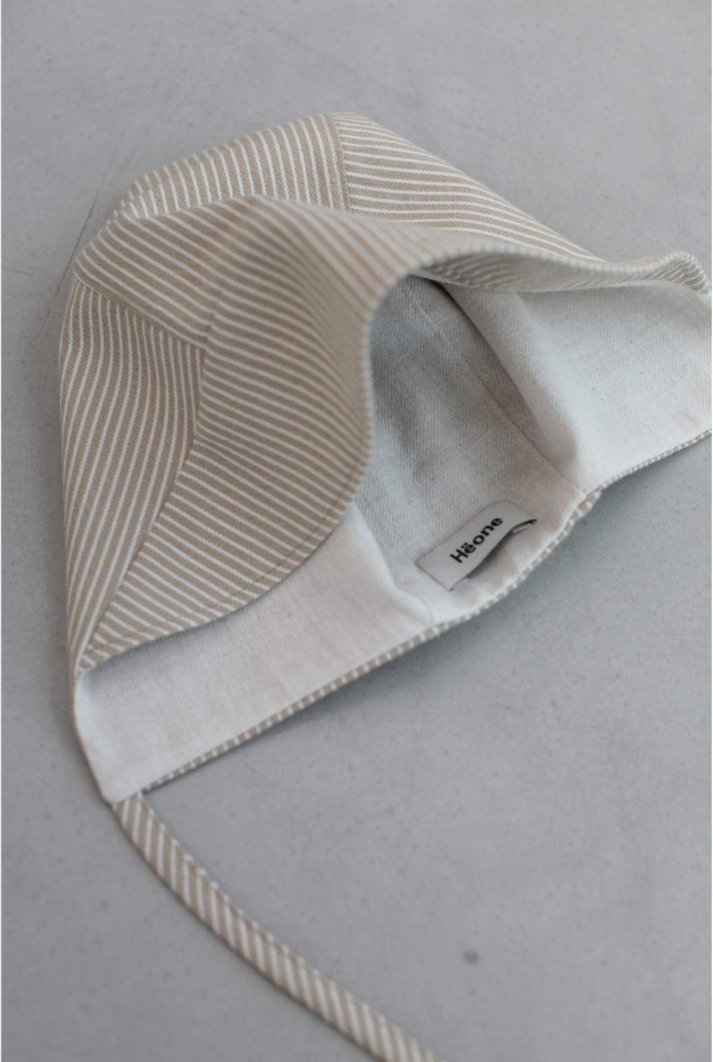 부드럽고 촉감이 좋은 베이지 스트라이프 원단과 오트밀 면 안감이 편안한 파이 썬보넷이에요.
